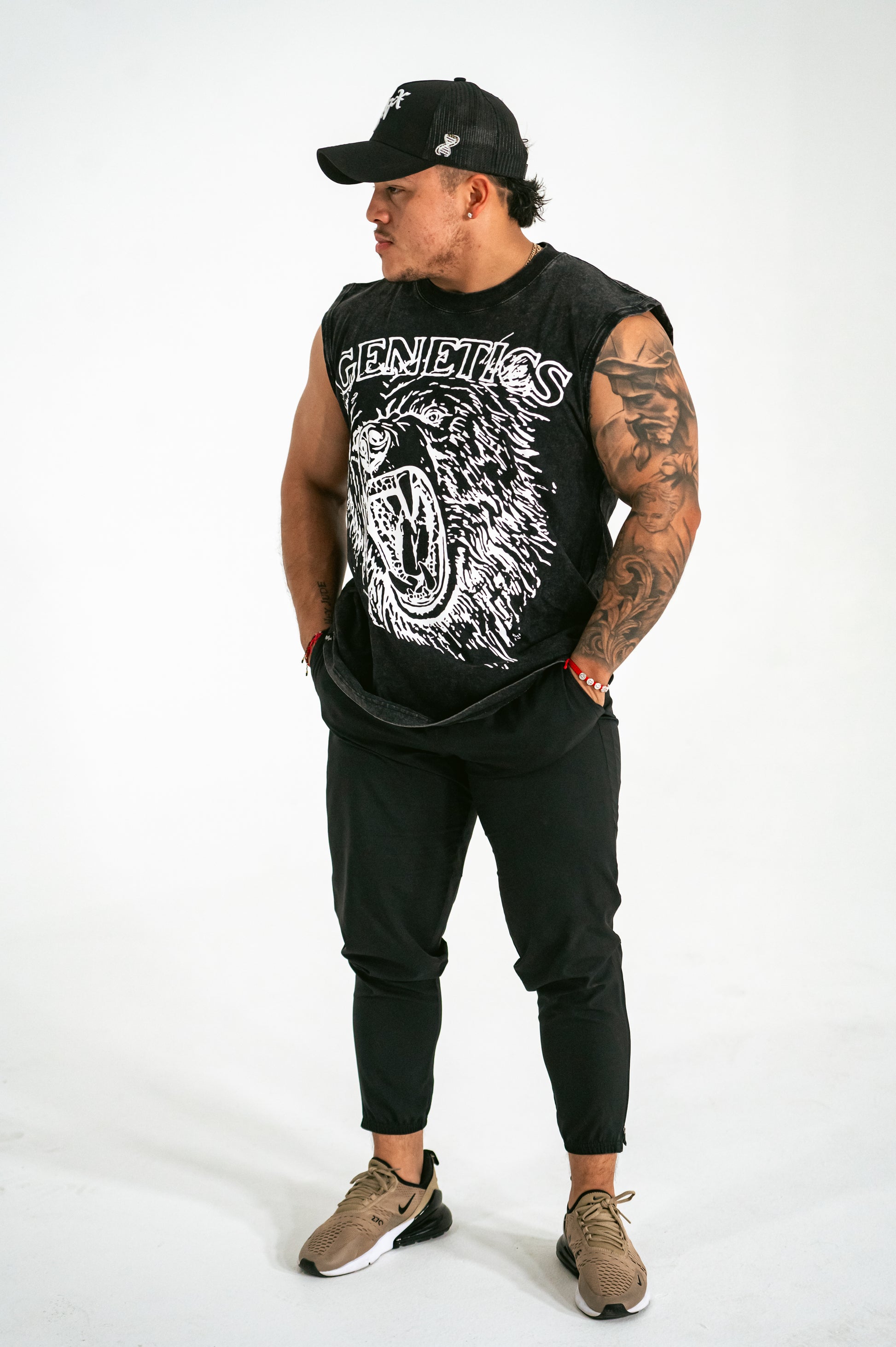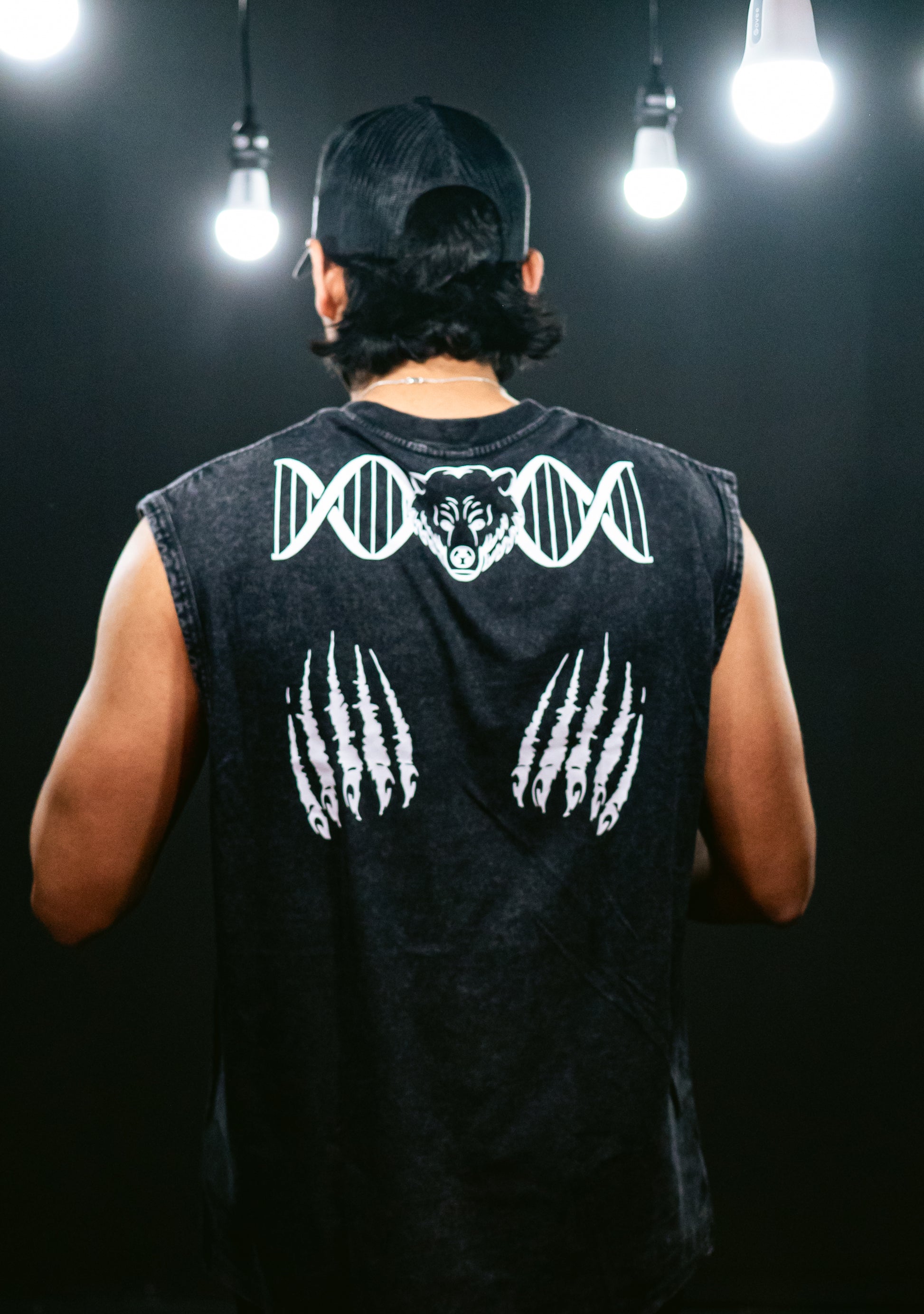 Unleash your daring side with our Bear Sleeveless Tee. Made with an edgy acid wash design and a bold bear print, this shirt is perfect for those who seek adventure. Take on any challenge with confidence in this unique and eye-catching tee.